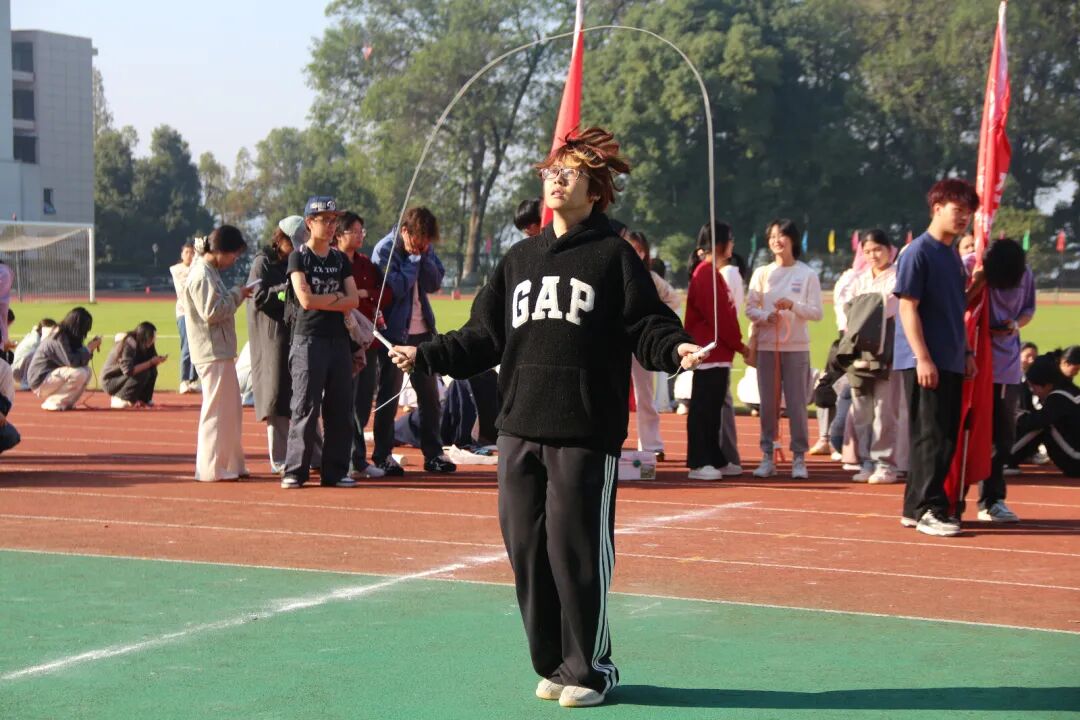 首先进行的是单人跳绳初赛。只见选手们个个神情专注,手腕飞快地摇动,脚尖轻点地面,绳索在空中呼啸生风,发出“嗖嗖”的响声。他们争分夺秒,不断突破自己的极限,展现了湖理学子的个人风采与扎实功底。