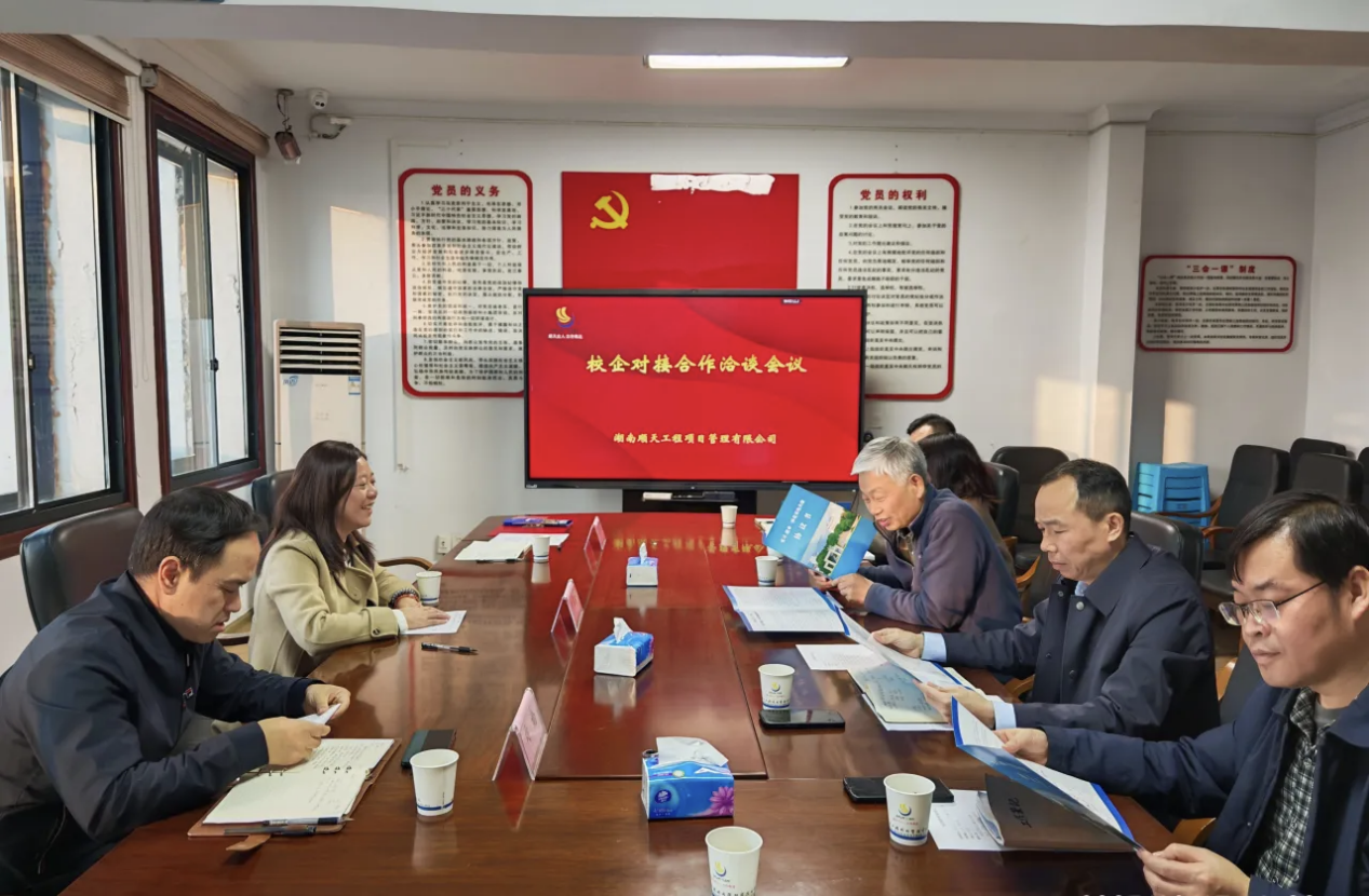 湖南顺天工程项目管理有限公司是主营建设工程监理业务的国有企业,在工程监理领域深耕三十载,具备深厚的行业底蕴和影响力。土建学院访企代表受到了公司董事长赵双喜、总经理易军及公司优秀校友的热情接待。洽谈会议上,双方就各自单位概况与发展、行业转型、城市更新改造和历史建筑保护工程等新领域、学生实习与就业合作进行深入探讨,就进一步提升毕业生专业素养、工程技能和适应能力交换意见。会后双方签署实习与就业一体化基地建设合作协议。