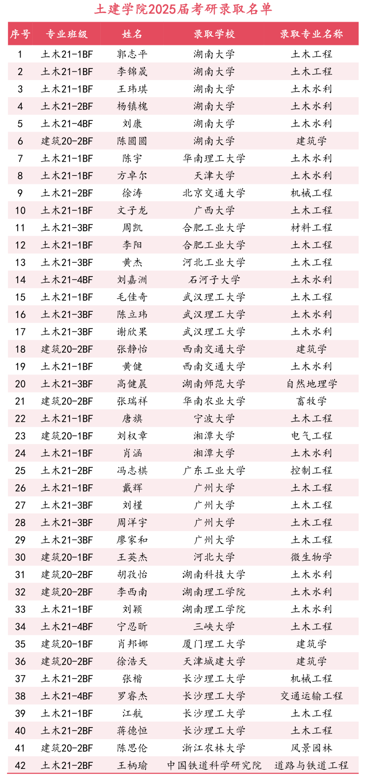 土建学院2025届学子考研再创佳绩!42名本科生被湖南大学、天津大学、华南理工大学、北京交通大学、西南交通大学、武汉理工大学、湘潭大学等高校录取。